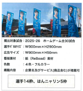 1.シーズンを通してアリーナ入り口のぼりに社名掲載(ホームゲーム30試合)